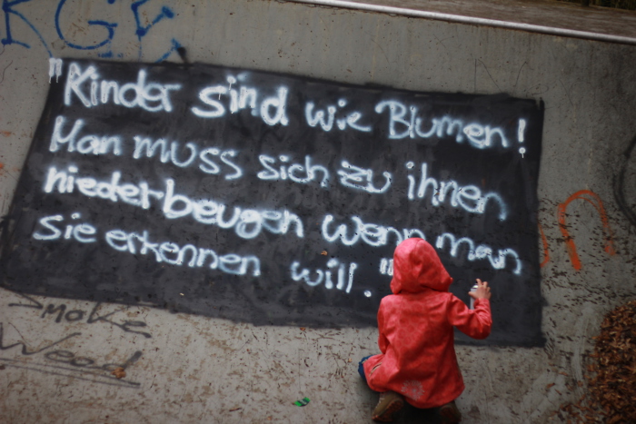 Unsere Lehrerin hat uns die Aufgabe gegeben, zehn Bilder zu dem Aktuellen Wettbewerbsthema zu machen. Wir haben uns in Gruppen zusammen geschlossen und erst einmal Ideen gesammelt. Nach und nach wollten wir Dinge fotografieren, die Fröbel hinterlassen hat z.B. die Stätte in Schweina. Jedoch haben wir uns dann dazu endschieden, ein Zitat von Fröbel an einem Ort ab zu fotografieren, wo sich viele Jugendliche und Kinder aufhalten. Die Skaterbahn in Bad-Wildungen ist ein beliebter Treffpunkt für die Jugendlichen, aber auch für die Grundschulkinder der Schule und der Sportkurse die in einer Sporthalle, neben der Skaterbahn stattfinden. Wir sind Schüler des Evangelischen Fröbelseminars in Korbach. Die Bilder sind in der Gruppe endstanden. An den Bildern beteiligt waren: Michelle Schwenke, Alisa Galip, Saphira Khaiberae, Nils Pfeiffer, Leon Schäfer und Konstantin Kollmar.
